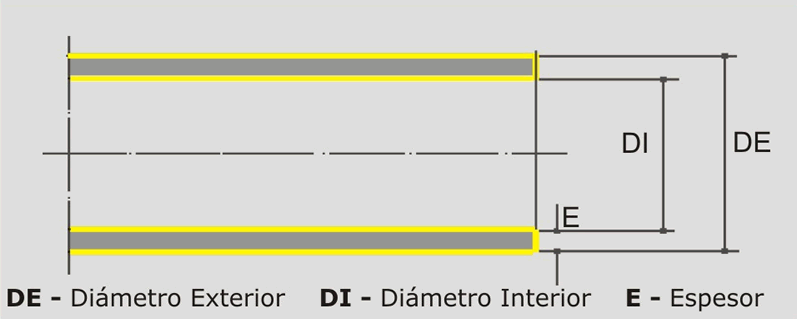 DE - diámetro exterior, DI - diámetro interior, E - espesor